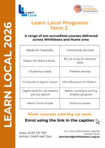 We’re excited to share our Learn Local Program offerings for Term 2, delivering a range of pre-accredited courses across the Whittlesea and Hume areas.